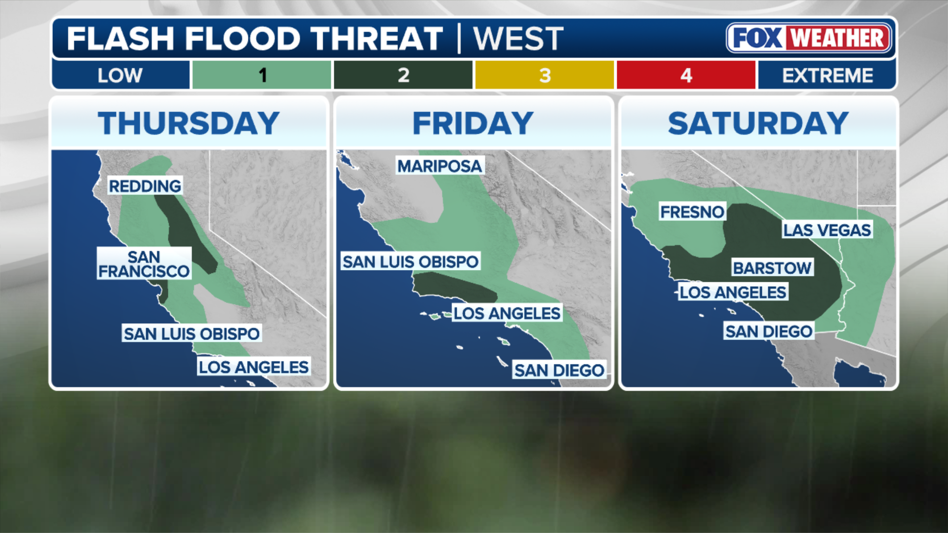The storm system is forecast to bring several months' worth of rain to Southern California in the span of just a few days, while a flash flood threat covers the Bay Area and Northern California Thursday.
