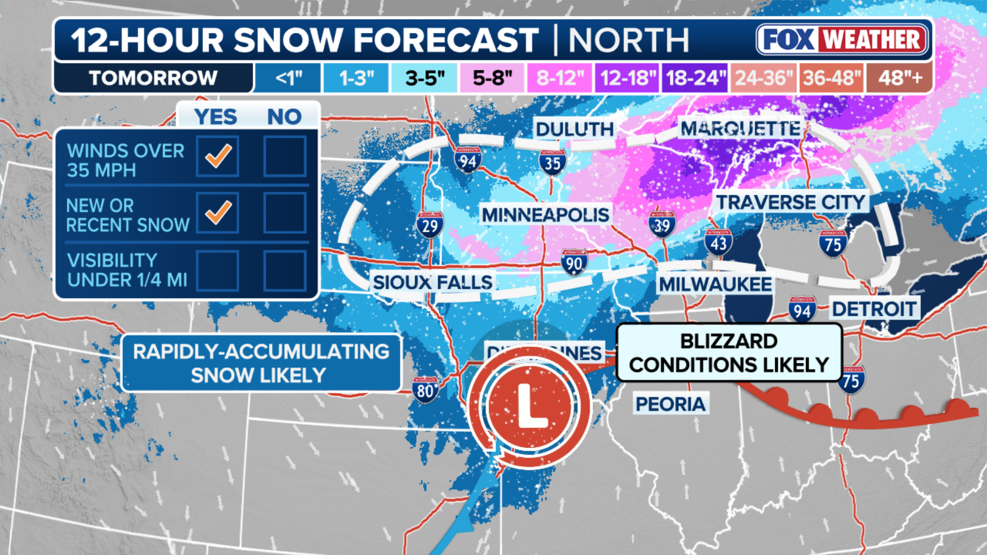 Limited visibility is likely due to blowing moderate to heavy snow, which could lead to blizzard conditions across Minnesota, Wisconsin and northern Michigan. This includes cities such as Minneapolis, Marquette, MI and Green Bay, WI.