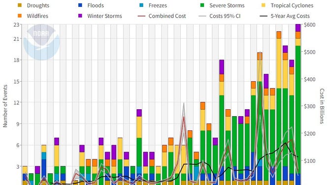 Numbers have been steadily increasing, though. In the past five years, there have been an average of 18.0 disasters per year. The cost totaled an average of $124.6 billion and 350 lives each year. The past three years saw an average of 20 disasters a year.
