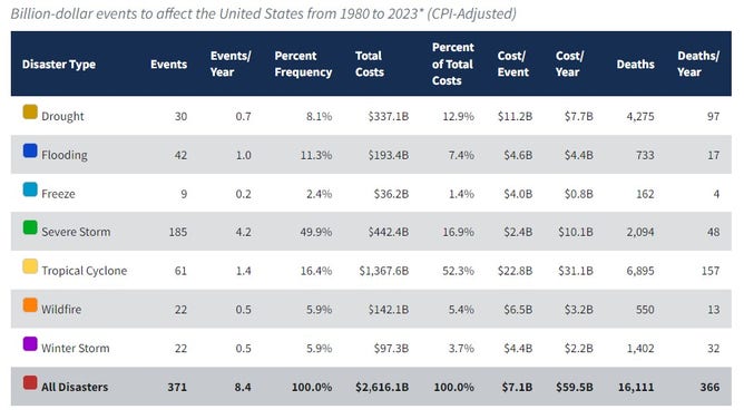 Since 1980, the U.S. suffered 372 billion dollar events costing $2,635.1 billion and taking a total of 16,231 lives.