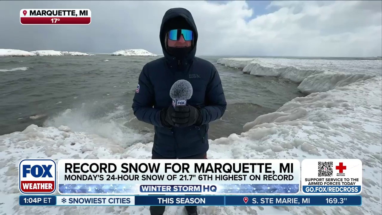 Marquette, Michigan received more than 3 feet of snow during a historic blizzard Sunday and Monday. Lake Superior's waves were massive, crashing up onto the shorelines and coating everything in a thick layer of ice. FOX Weather Correspondent Robert Ray shows us how things are looking today and details some of the magnificent formations of ice on the shores.