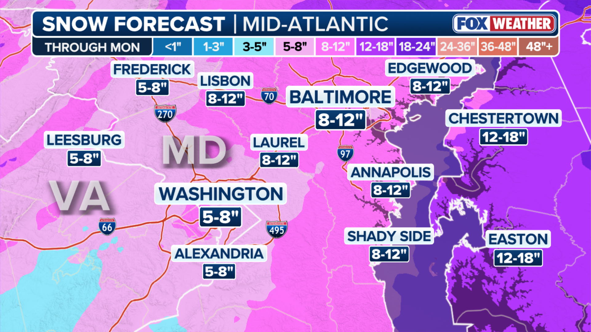 In Baltimore, snow totals are trending upward, with forecasters predicting between 8-12 inches of snow.