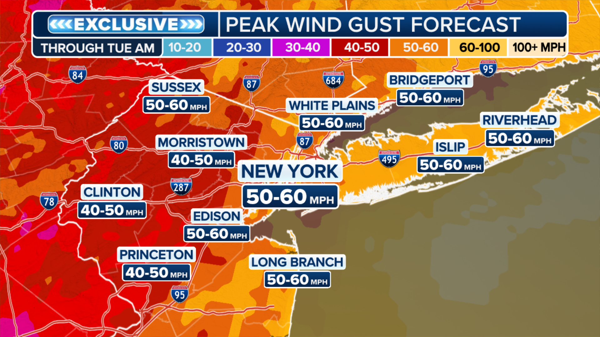 Wind gusts will peak around 50-60 mph and a Coastal Flood Warning is also in effect for the city.