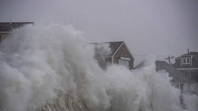 Waves crash over oceanfront homes during a noreaster in Scituate, Massachusetts on January 29, 2022. - Blinding snow whipped up by near-hurricane force winds pummeled the eastern United States on January 29, as one of the strongest winter storms in years triggered severe weather alerts, transport chaos and power outages across a region of some 70 million people. (Photo by JOSEPH PREZIOSO / AFP) (Photo by JOSEPH PREZIOSO/AFP via Getty Images)
