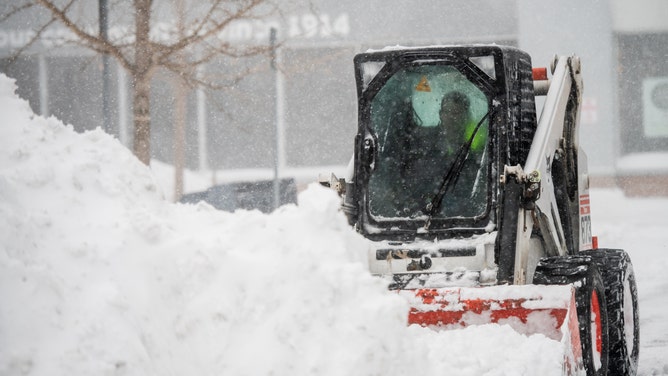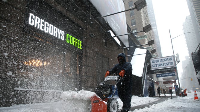 NEW YORK, NEW YORK - JANUARY 29: A worker clears snow with a blower during a Nor'easter storm on January 29, 2022 in New York City. The first nor’easter of 2022 blanketed New York City with snow and high winds. (Photo by John Lamparski/Getty Images)