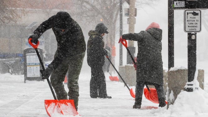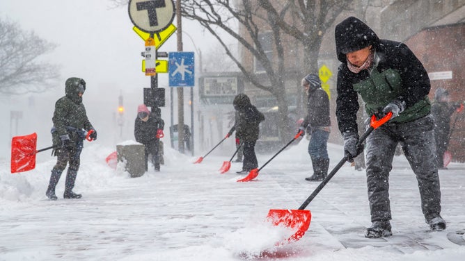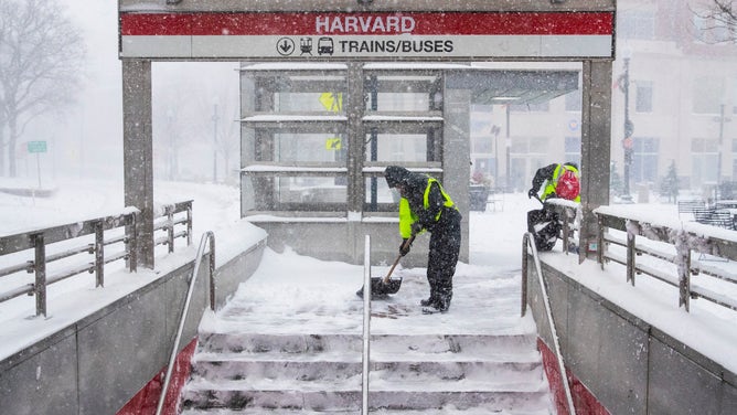SOMERVILLE, MA - JANUARY 29: People shovel outside of the Davis Square MBTA station during a snowstorm on January 29, 2022 in Somerville, Massachusetts. A powerful noreaster brought blinding blizzard conditions with high winds causing widespread power outages to much of the Mid-Atlantic and New England coast. The storm is predicted to drop over 2 feet of snow in some areas.(Photo by Adam Glanzman/Getty Images)