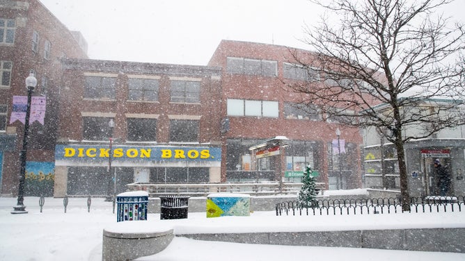 CAMBRIDGE, MA - JANUARY 29: A general view of Harvard Square during a snowstorm on January 29, 2022 in Cambridge, Massachusetts. A powerful noreaster brought blinding blizzard conditions with high winds causing widespread power outages to much of the Mid-Atlantic and New England coast. The storm is predicted to drop over 2 feet of snow in some areas. (Photo by Adam Glanzman/Getty Images)