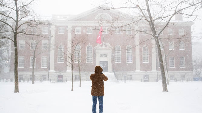 CAMBRIDGE, MA - JANUARY 29: A man takes pictures of the snow on campus at Harvard University during a snowstorm on January 29, 2022 in Cambridge, Massachusetts. A powerful noreaster brought blinding blizzard conditions with high winds causing widespread power outages to much of the Mid-Atlantic and New England coast. The storm is predicted to drop over 2 feet of snow in some areas. (Photo by Adam Glanzman/Getty Images)