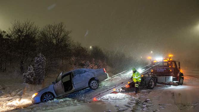 A car is towed off the side of the road after veering off during a snow storm in Braintree, Massachusetts on January 29, 2022. - A powerful winter storm packing heavy snow and high winds pummeled the US East Coast Saturday, forcing the cancellation of thousands of flights as severe weather alerts were sounded across a region of around 70 million people. (Photo by JOSEPH PREZIOSO / AFP) (Photo by JOSEPH PREZIOSO/AFP via Getty Images)