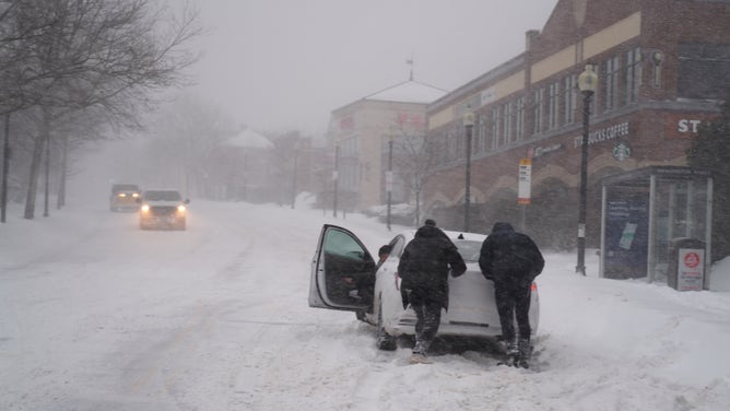 Residents help push a stuck car during a blizzard in Boston, Massachusetts, U.S., on Saturday, Jan. 29, 2022. A powerful winter storm is whipping the U.S. Northeast with high winds, crashing surf, and quickly piling up snow on the country's major transportation routes, while canceling flights and leaving thousands without power. Photographer: Allison Dinner/Bloomberg via Getty Images