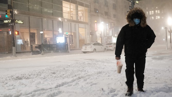 NEW YORK, NY - JANUARY 29: People walk through lower Manhattan in the pre-dawn hours as a winter storm brings heavy snow, freezing temperatures and blowing winds to the area on January 29, 2022 in New York City . With a state of emergency called in New York and New Jersey, much of the Northeast is expected to receive over a foot of snow during the day on Saturday. (Photo by Spencer Platt/Getty Images)