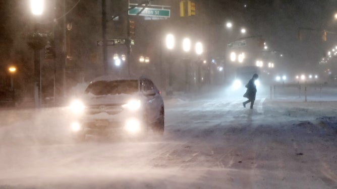 NEW YORK, NY - JANUARY 29: Traffic moves through lower Manhattan in the pre-dawn hours as a winter storm brings heavy snow, freezing temperatures and blowing winds to the area on January 29, 2022 in New York City. A powerful nor’easter brought blinding blizzard conditions with high winds causing widespread power outages to much of the Mid-Atlantic and New England coast. (Photo by Spencer Platt/Getty Images)