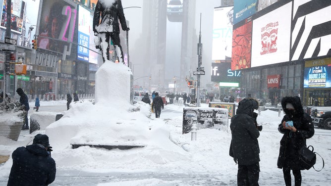NEW YORK, NEW YORK - JANUARY 29: People stand in front of a snow-covered statue in Times Square during a Nor'easter storm on January 29, 2022 in New York City. The first Nor’easter of 2022 blanketed New York City with snow and high winds. (Photo by John Lamparski/Getty Images)