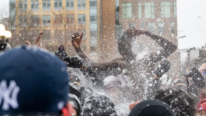 NEW YORK, NEW YORK - JANUARY 29: Chippi, 22, from Senegal screams while sitting on someone’s shoulder shirtless participating in a large snow ball fight in Washington Square Park on January 29, 2022 in New York City. A powerful nor’easter brought blinding blizzard conditions with high winds causing widespread power outages to much of the Mid-Atlantic and New England coast. There was a State of Emergency declared for New York City. (Photo by Alexi Rosenfeld/Getty Images)