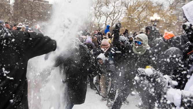 NEW YORK, NEW YORK - JANUARY 29: Hundreds of people participate in a large snow ball fight in Washington Square Park on January 29, 2022 in New York City. A powerful nor’easter brought blinding blizzard conditions with high winds causing widespread power outages to much of the Mid-Atlantic and New England coast. There was a State of Emergency declared for New York City. (Photo by Alexi Rosenfeld/Getty Images)