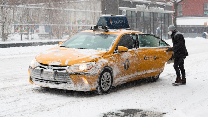 NEW YORK, NEW YORK - JANUARY 29: A person gets in a yellow cab on the Upper West Side on January 29, 2022 in New York City. A powerful nor’easter brought blinding blizzard conditions with high winds causing widespread power outages to much of the Mid-Atlantic and New England coast. There was a State of Emergency declared for New York City. (Photo by Noam Galai/Getty Images)