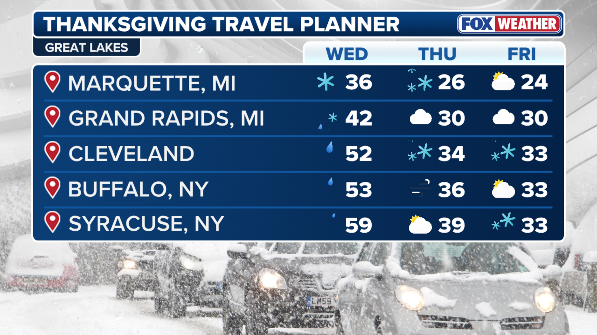 The Great Lakes Snowbelt in Ohio, Pennsylvania, western New York, and New York's Tug Hill Plateau are also expected to receive feet of lake-effect snow, with the worst of the snow expected to fall on Thanksgiving Day.