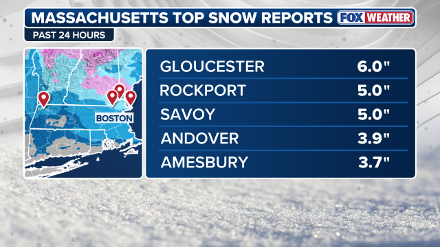 Both Hamilton and Salisbury, MA, received 13 inches of snow, according to the FOX Forecast Center.
