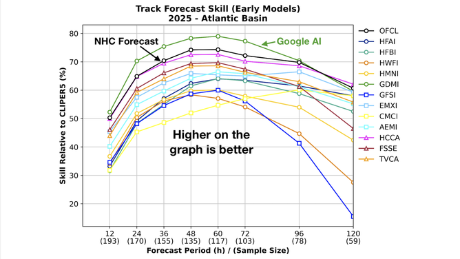 The NHC ranks the models at the end of every season. In 2025, the Google DeepMind AI model ended up producing the best forecast — both in terms of where the storm was going to track and how strong it was going to be.