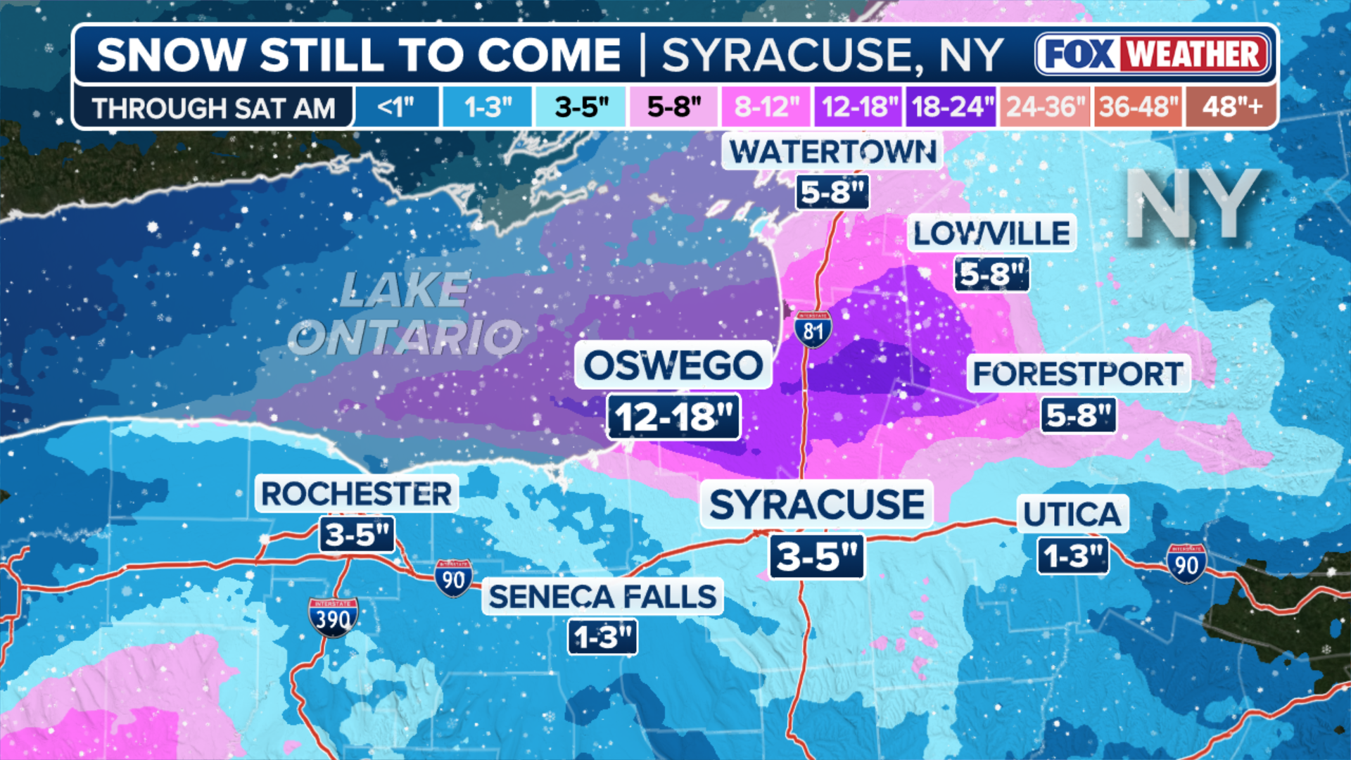 Oswego, New York, is under a Winter Storm Warning until Saturday morning, when the area can expect 12 to 18 inches of snow. At the same time, Syracuse can expect to see 3 to 5 inches of snow.