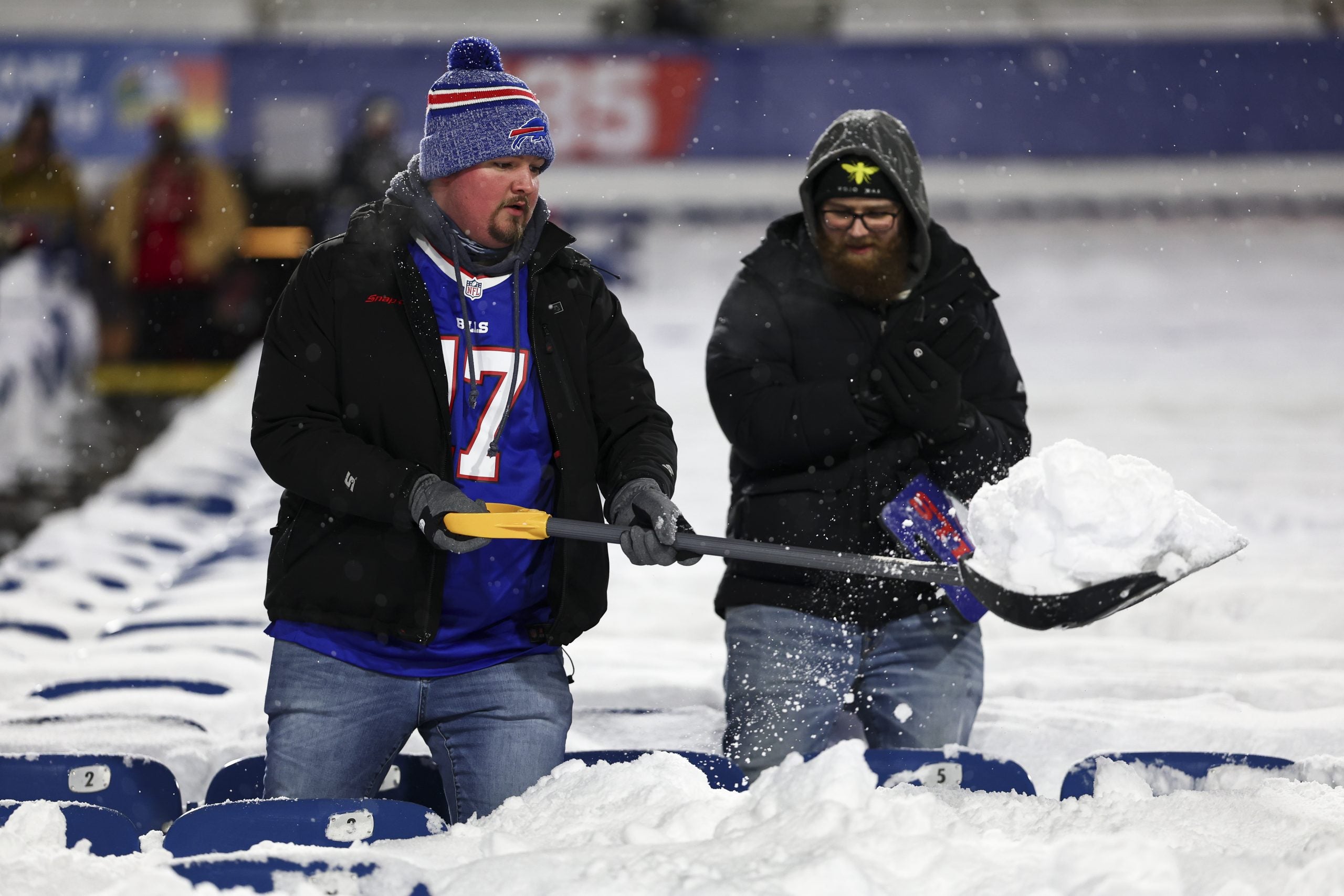 ORCHARD PARK, NEW YORK - DECEMBER 1: Buffalo Bills fans shovel snow from seats prior to an NFL football game between the Buffalo Bills and the San Francisco 49ers at Highmark Stadium on December 1, 2024 in Orchard Park, New York.