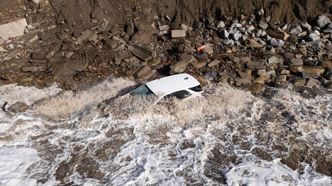 MALIBU, CA - FEBRUARY 14: A fire department vehicle gets covered in waves on Friday, Feb. 14, 2025 in Malibu, CA after it got washed over a cliff in the 19600 block of Pacific Coast Highway during Thursday's storm. The driver survived. (Myung J. Chun / Los Angeles Times via Getty Images)