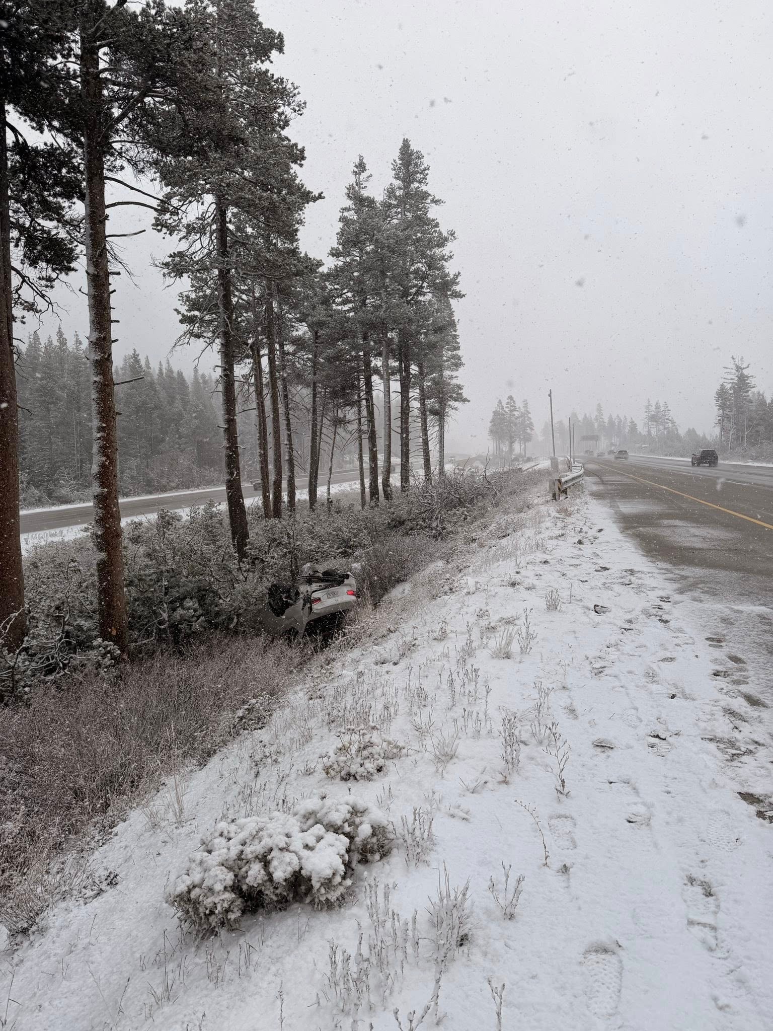 On Facebook, California Highway Patrol-Truckee shared a photo of the wayward vehicle and warned travelers of the slick roads, and added, "Donner Summit wasted no time reminding everyone who runs the mountain."