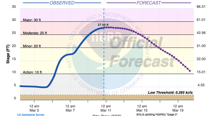 Going from 10.1 ft to 27.7 ft in five days is a dramatic jump — more than 2.5 times above normal river levels and well above the flood threshold.