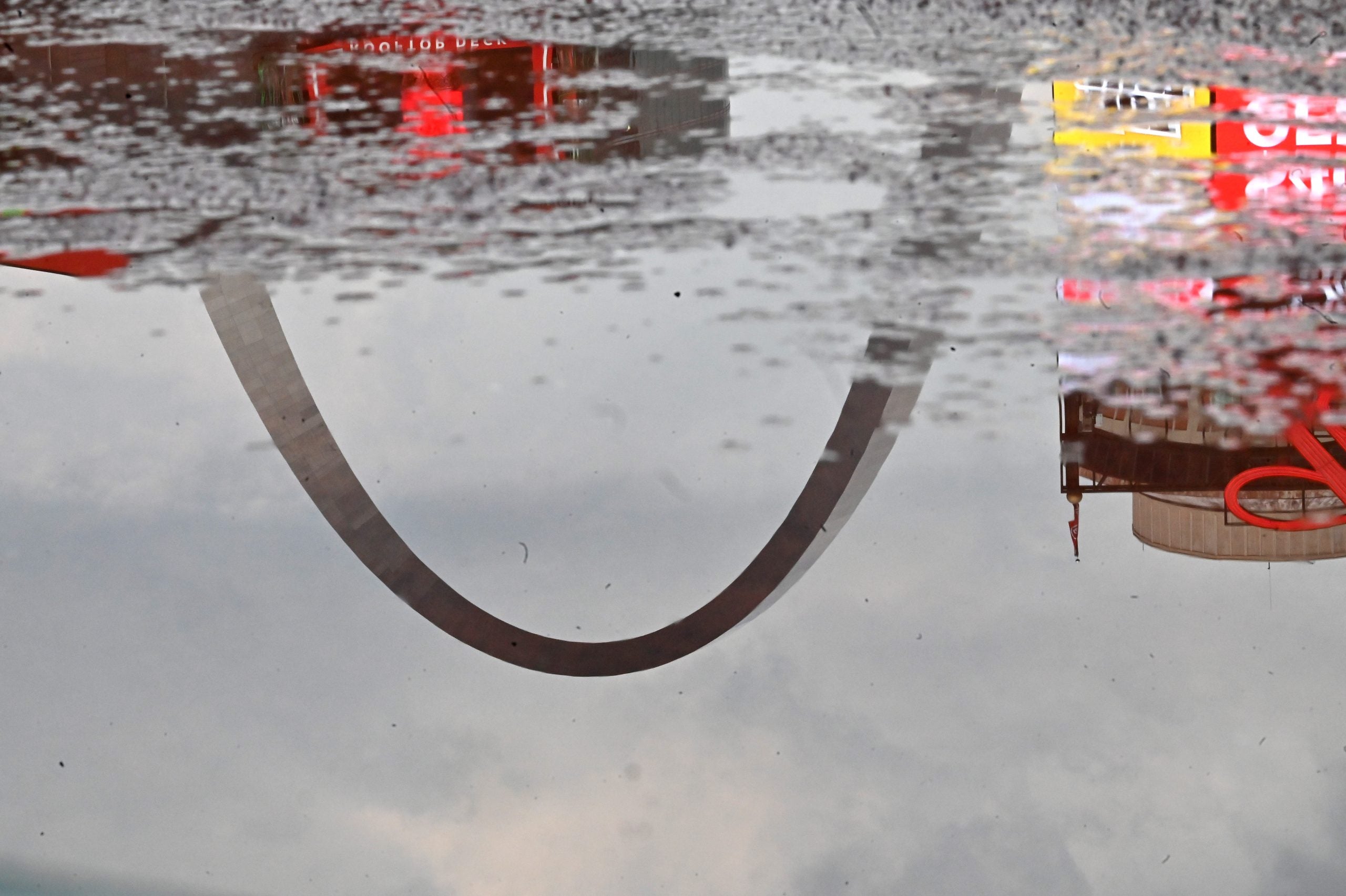 ST. LOUIS, MO - JULY 15: The St. Louis Gateway Arch is reflected in a puddle of water left on the infield after a rainstorm before the second game of a MLB doubleheader between the Washington Nationals and the St. Louis Cardinals on July 15, 2023, at Busch Stadium in St. Louis, Mo.