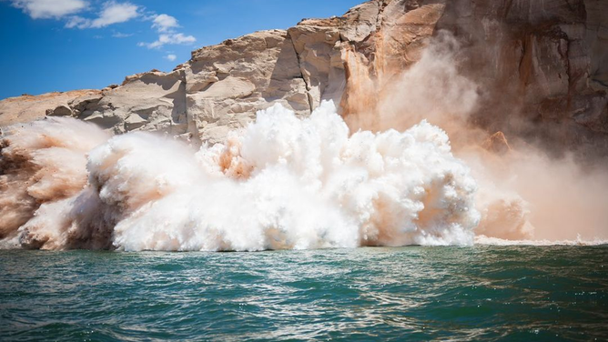 LAKE POWELL, Ariz. – A massive cliff broke off and tumbled into Lake Powell Monday, sending up a towering plume of water and debris.
