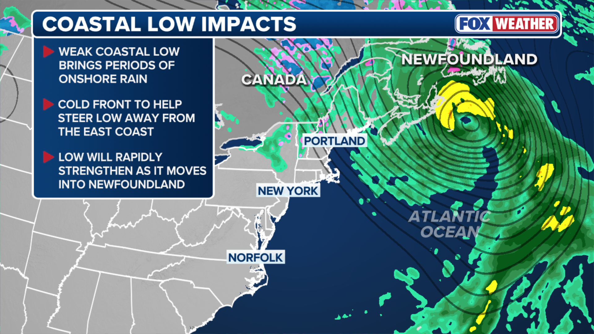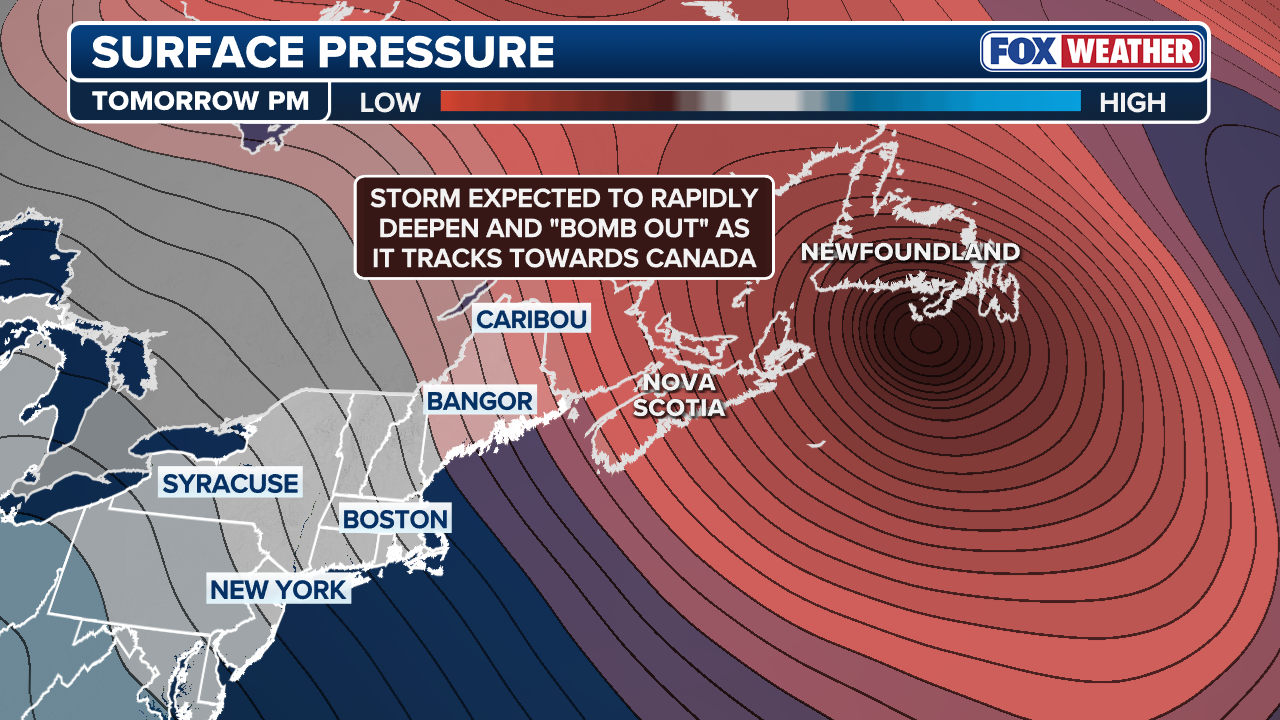 However, the low pressure system will eventually undergo "bombogenesis" as it sweeps toward Newfoundland, Canada.