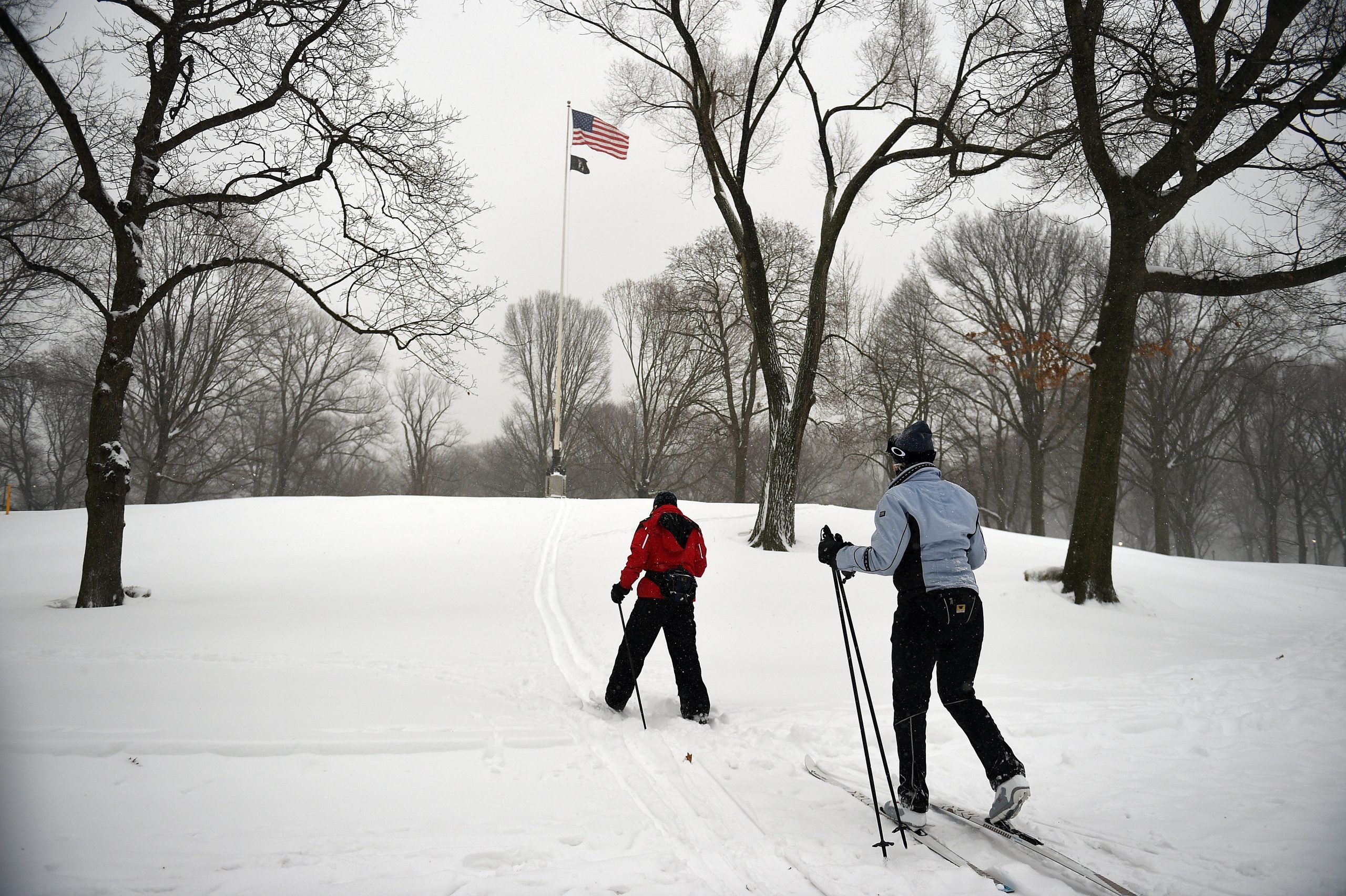 NEW YORK, NY - JANUARY 23: Cross-country skiers exercise through Central Park on January 23, 2016 in New York City. A major Nor'easter is hitting much of the East Coast and parts of the South as forecasts warn of up to two feet of snow in some areas.