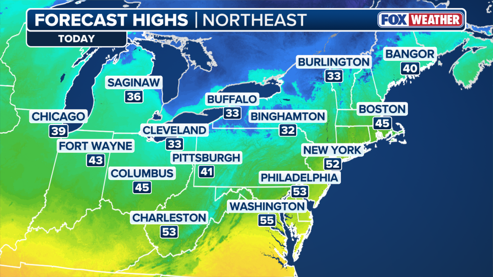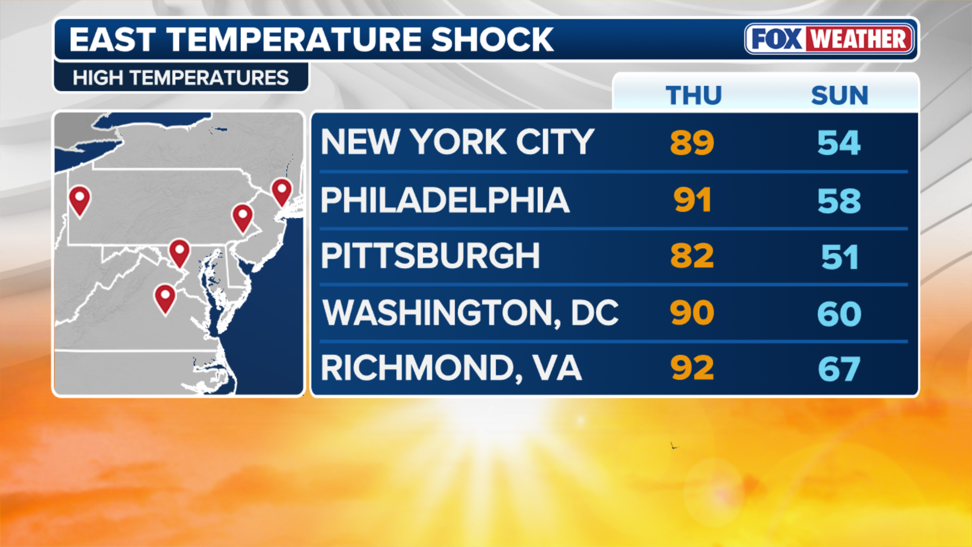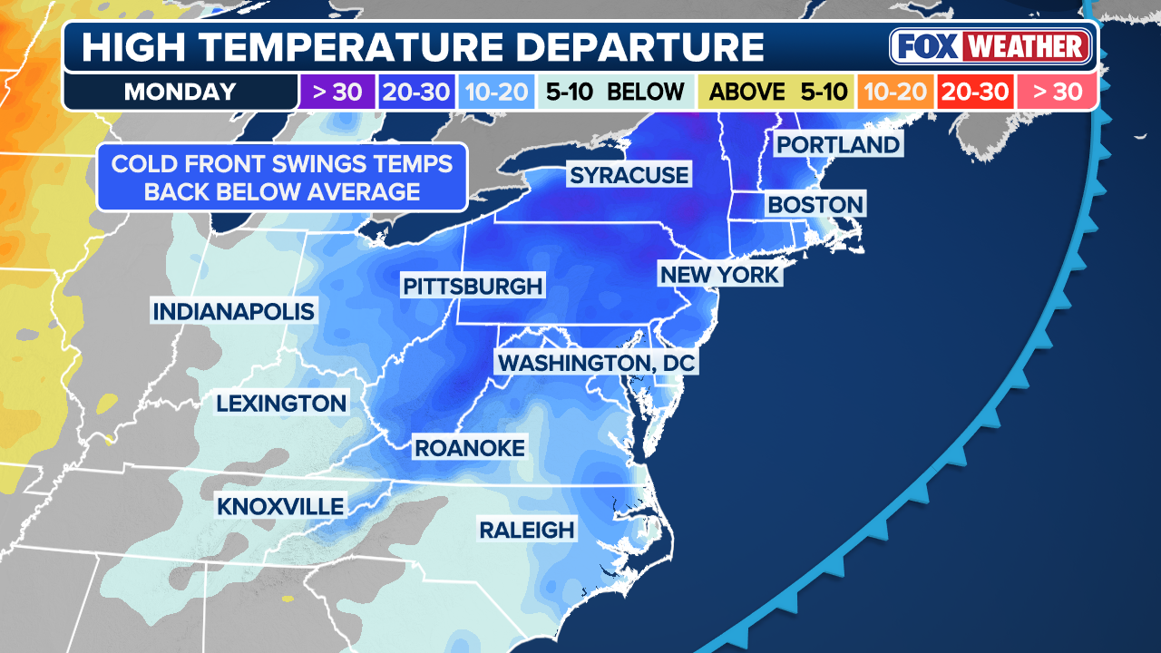 Some notable temperature drops include Pittsburg, Pennsylvania, where a high near 80 on Saturday will fall to a morning low of 32 degrees by Monday, according to the FOX Forecast Center. That's a near-50 degree drop.