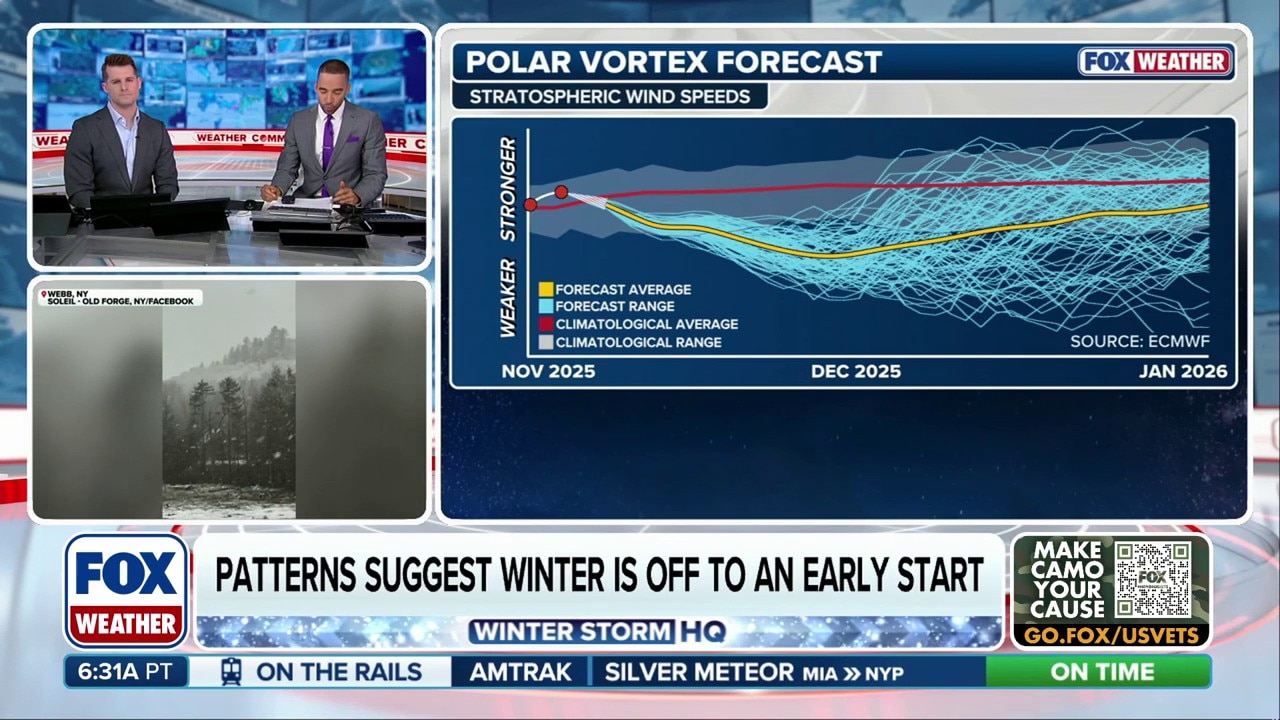 According to the FOX Forecast Center, two weather patterns, La Niña and an easterly Quasi-Biennial Oscillation, will allow more rounds of arctic air that is typically trapped high above the North Pole to spill into the lower levels of the atmosphere and south into the Eastern U.S.