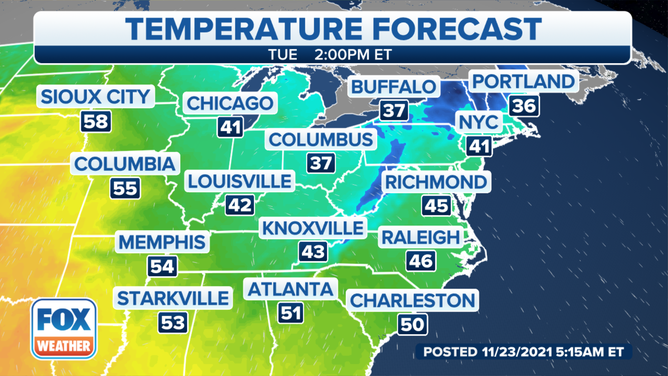 People in the eastern half of the United States will need to grab a jacket before heading out Tuesday as colder air settles in just in time for Thanksgiving.