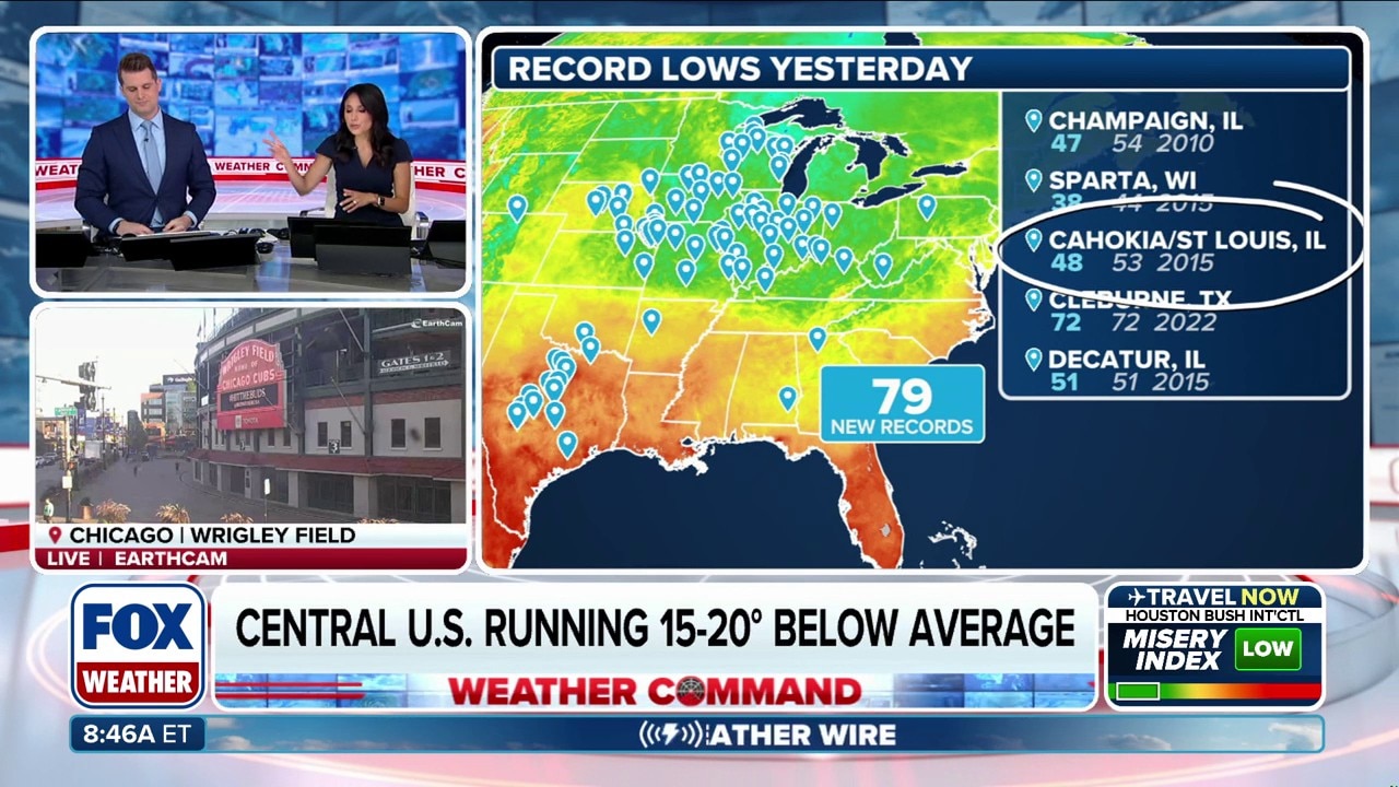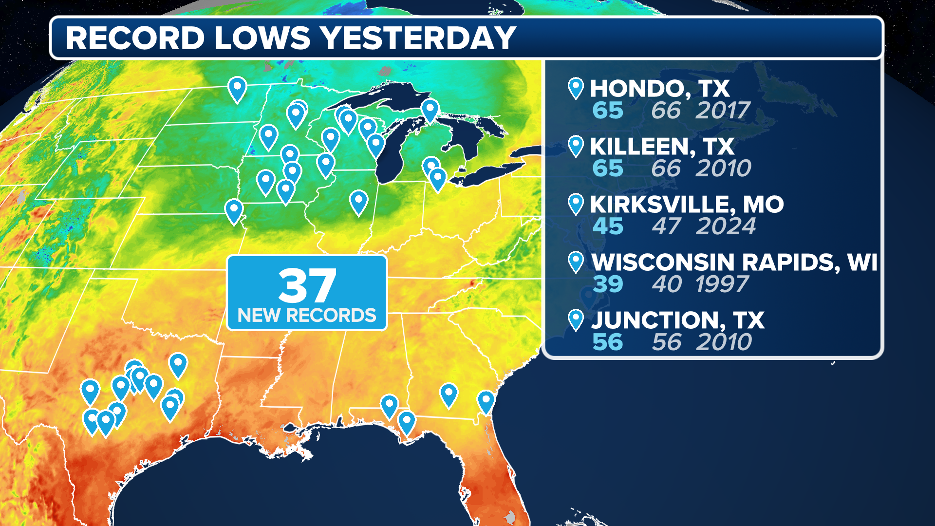 At least 80 record-low temperatures were set Tuesday, mostly across the central U.S., including Kansas City, Missouri, which dipped to 50 degrees.