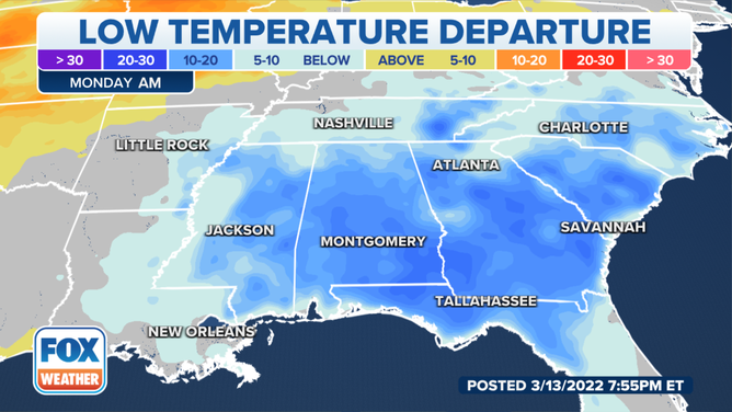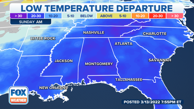Sunday morning's low temperatures were 20 to 30 degrees below the average low. Ten cities broke their records including Biloxi, Mississippi and Columbus, Georgia which blew the old records away by 5 degrees.