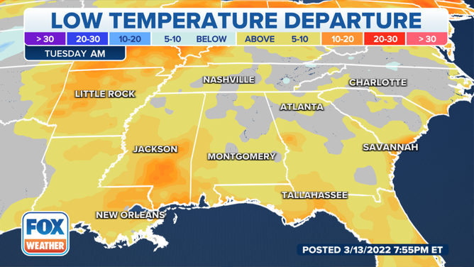 Overnight temperatures will further moderate on Tuesday where areas will be a few degrees above the average low.