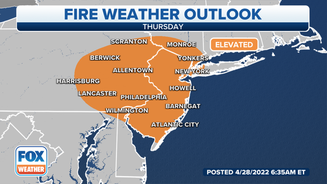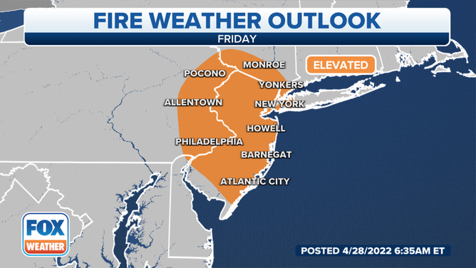 New Jersey will see the highest risk on both days, but areas of central and eastern Pennsylvania, the New York City tri-state area and northern Delaware will also see an increased risk of fires.