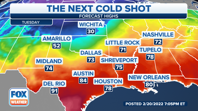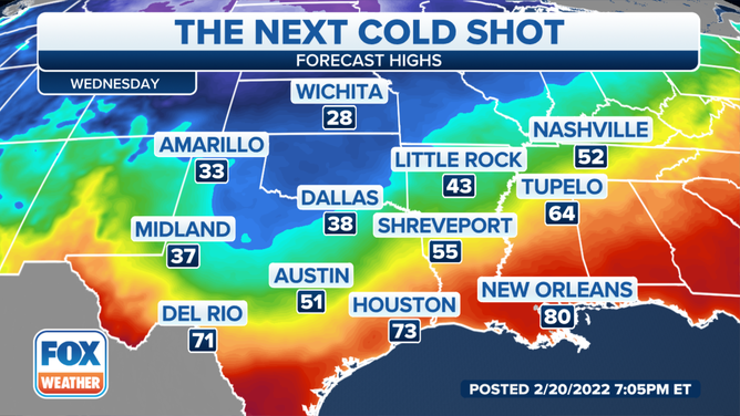- Lubbock, Texas – Monday’s high 74 drops to 37 on Wednesday
