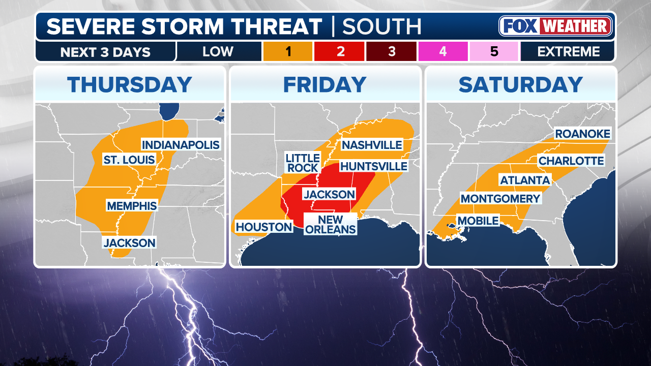 A cold front associated with the first storm will move into the Deep South on Friday, sparking the potential for the most significant severe weather threat this week.