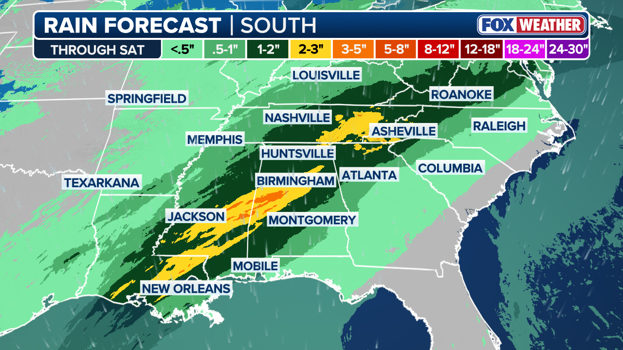 NOAA's Weather Prediction Center has issued a Level 2 out of 4 threat of flash flooding for Middle Tennessee, Mississippi and northern Alabama through Saturday, where more than 2-3 inches of rain is expected with localized pockets of up to 5 inches possible.
