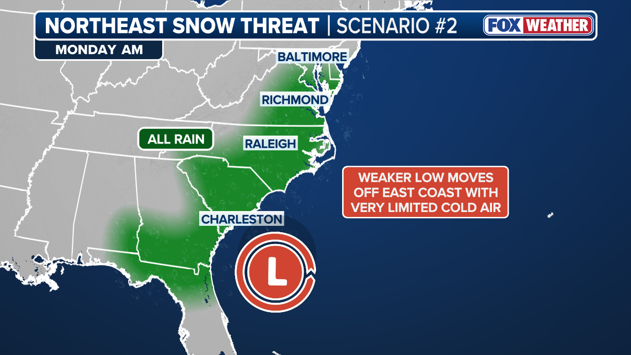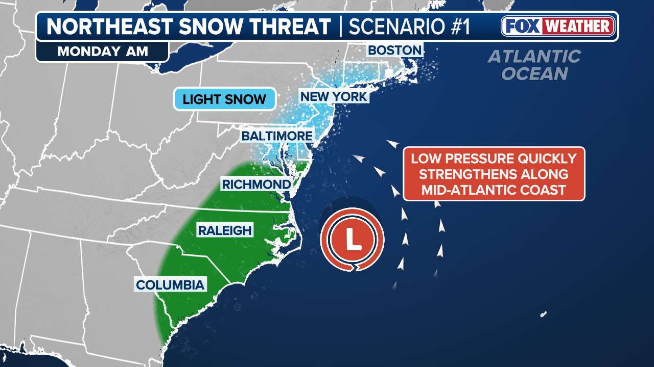 This scenario maintains that the cross-country storm will move far enough north along the Eastern Seaboard to produce light snow Sunday night into Monday morning.