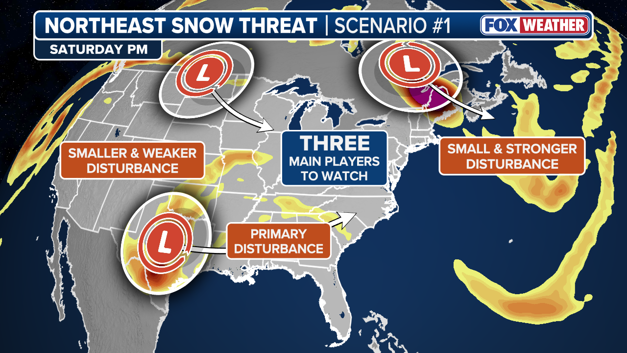The FOX Forecast Center is tracking three areas of low pressure that would need to come together at the same time in order to produce heavy snow across the northeastern portion of the Interstate 95 corridor.