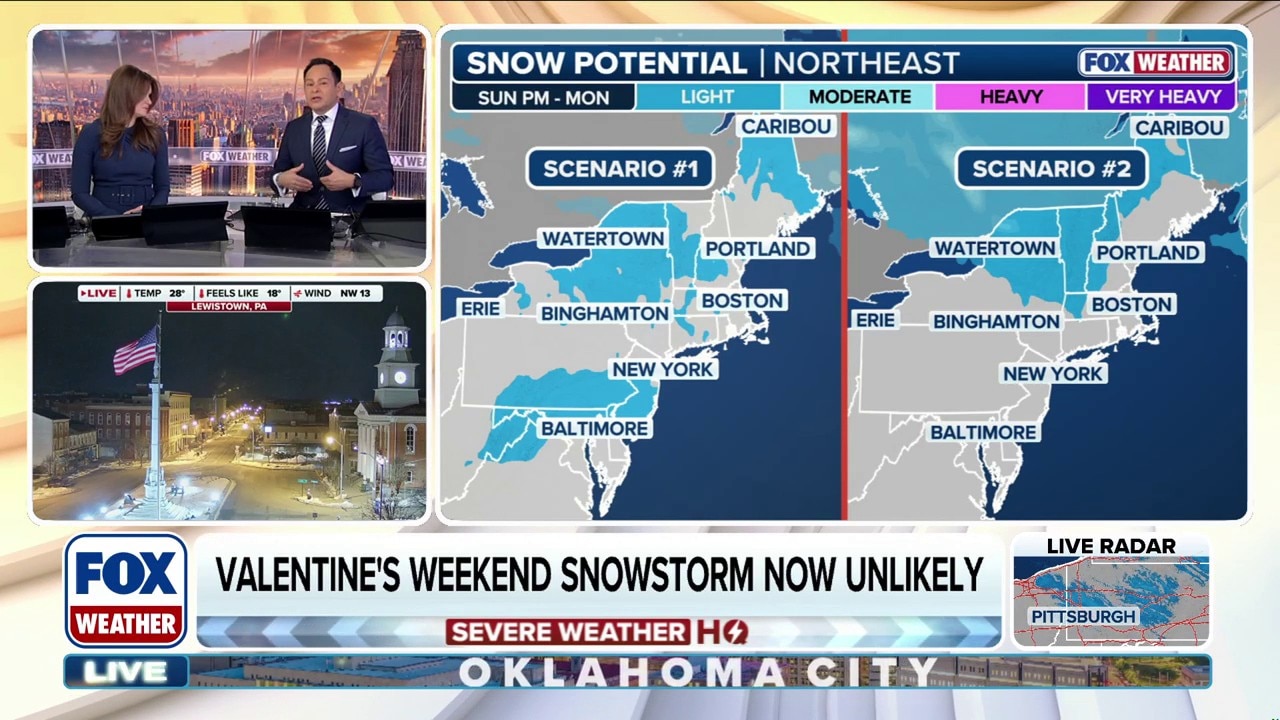NEW YORK – The FOX Forecast Center is closely monitoring a complicated snow forecast for the Northeast this Valentine's and Presidents' Day weekend. Fortunately for those celebrating this holiday weekend, a major winter storm appears to be unlikely, according to the latest computer forecast models.