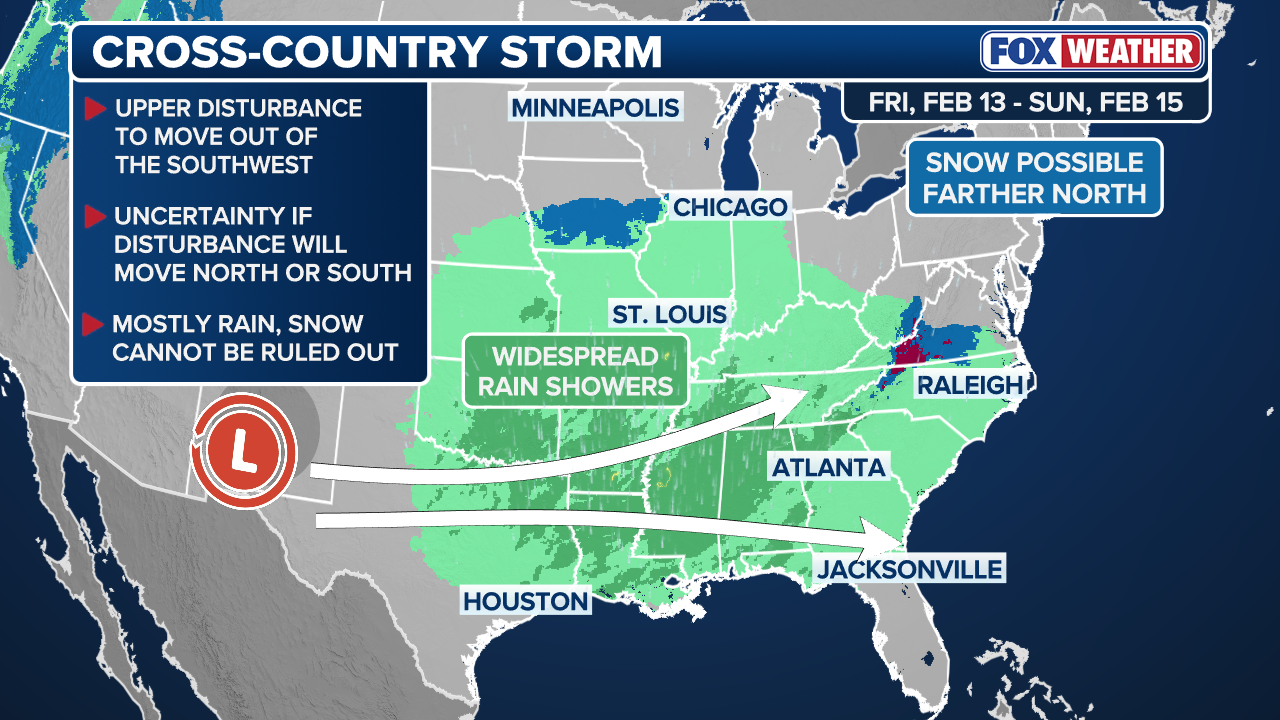 A potential cross-country storm is expected to move into the Southwest or Southern Plains this weekend, with impacts depending on how the system develops. One scenario favors the South with rain and snow, while another shifts the threat northward, bringing the potential for significant snowfall.