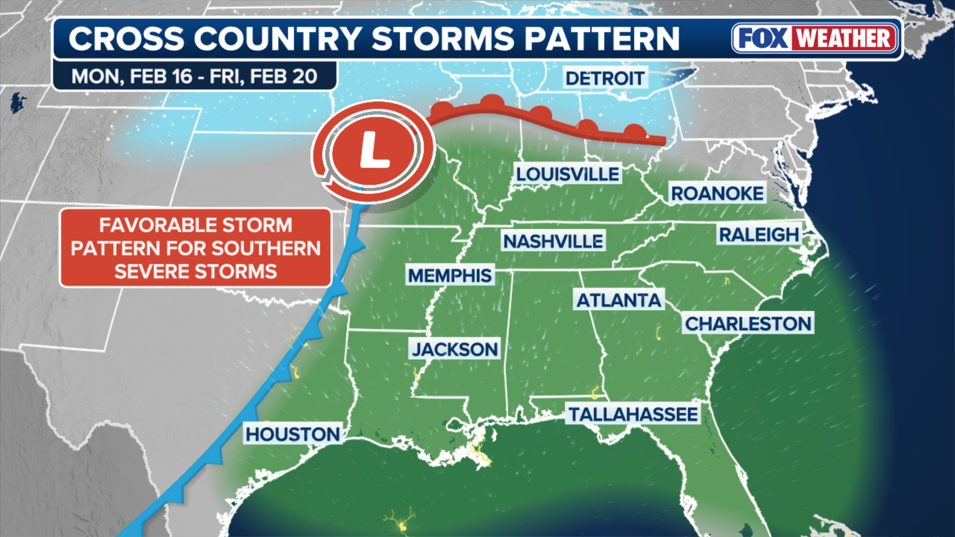An area of high pressure in the Southeast will promote warmer air and instability, resulting in stronger thunderstorms.