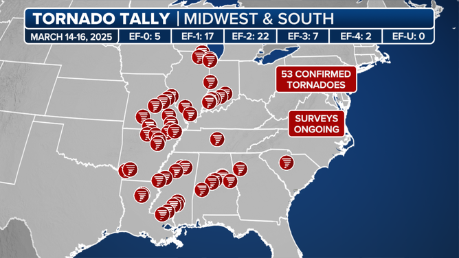 The FOX Forecast Center has confirmed at least 56 tornadoes in 10 states so far, including EF-3 and EF-4 tornadoes, and storm survey teams from the National Weather Service will be out in full force to inspect damage and determine the intensity and path of additional twisters.