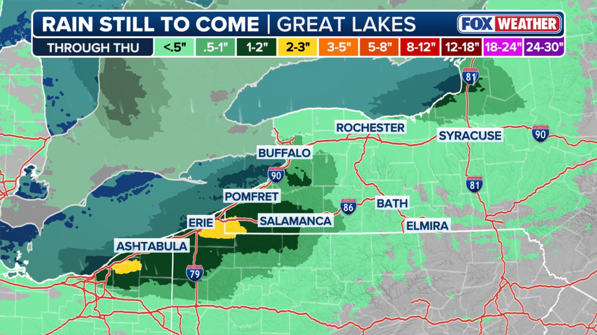 The National Weather Service offices in Buffalo, New York, and Cleveland are describing the setup as a "long-duration" and "prolonged" lake-effect rain event, respectively. A widespread 1-2 inches of rain, with locally up to 3 inches, is expected along the Interstate 90 corridor between Buffalo and Cleveland through the end of the week.