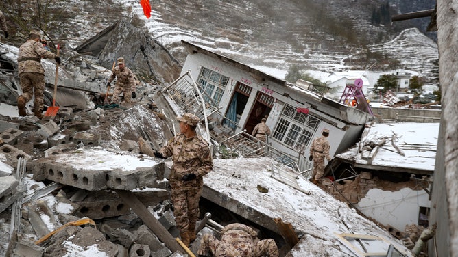 Search and rescue teams search for signs of life under feet of rubble that buried two villages in China Monday. Frigid temperatures put any survivors in further risk.